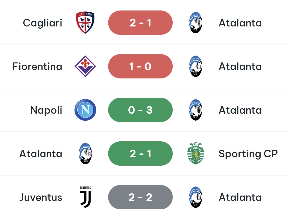 - Atalanta gần đây có 2 thắng, 1 hòa, 2 thua trong 5 trận gần đây. Gần nhất, Atalanta thua Cagliari 2-1 ở Serie A.