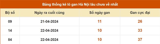 Thống kê lô gan miền Bắc tính tới 9/5/2024